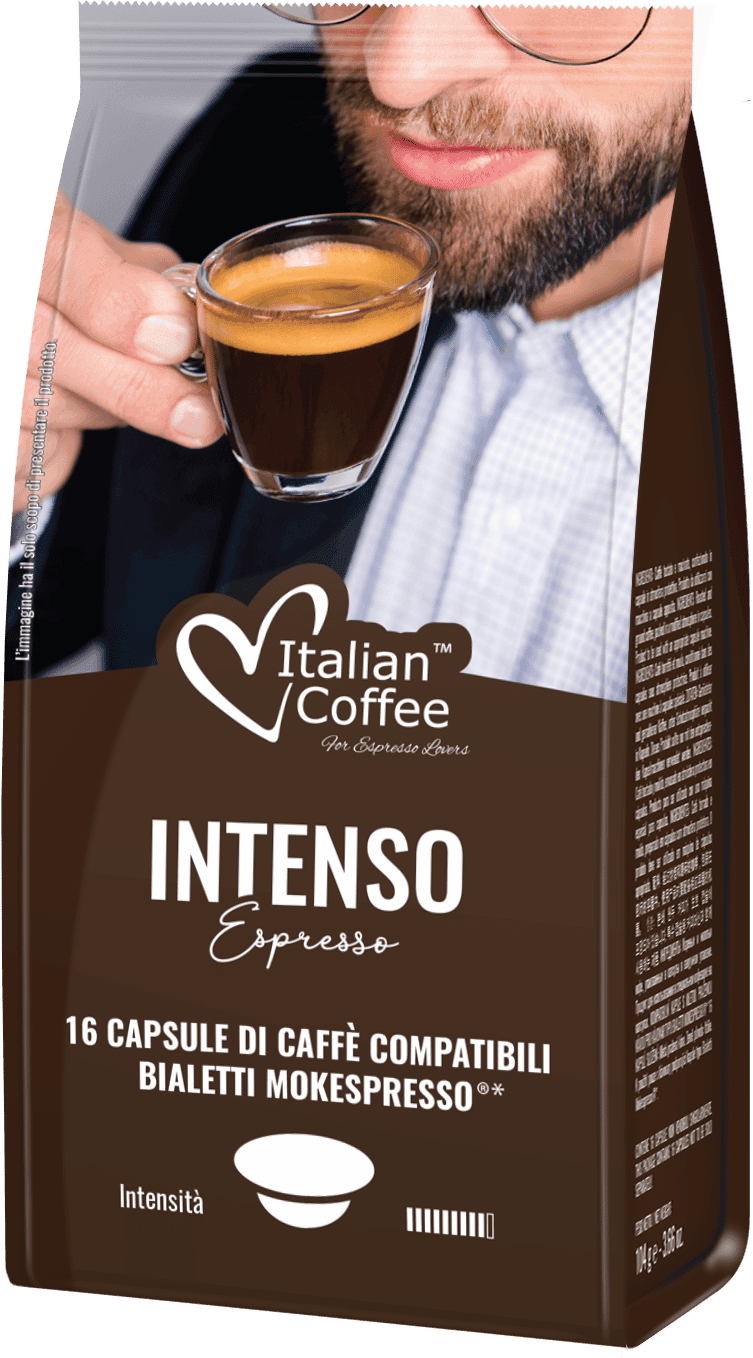 Italian Coffee Intenso – Czy dla Ciebie mała czarna powinna być przede wszystkim mocna? Jeżeli tak, to z pewnością spodoba Ci się smak Intenso. Ta kawa szybko postawi Cię na nogi i doda energii. Z kapsułek kompatybilnych z systemem Bialetti Caffe D’Italia® bardzo szybko i prosto przygotujesz aromatyczne i intensywne espresso. W kapsułkach kompatybilnych z systemem Bialetti Caffe D’Italia® zostały zamknięte bardzo wysokiej jakości ziarna Arabiki i Robusty. To połączenie sprawia, że kawa jest z jednej strony bardzo intensywna, a z drugiej nie jest ani zbyt gorzka ani kwasowa w smaku. Wysoka zawartośc Robusty sprawa, że mieszanka Intenso zawiera wystarczająco dużo kofeiny, aby pobudzić Cię do działania o poranku.