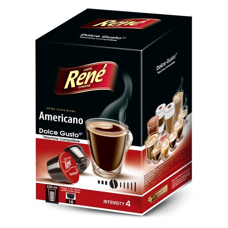 RENE Americano to wygodne w przygotowaniu kapsułki zawierające wyjątkową w smaku kawę paloną i mieloną.