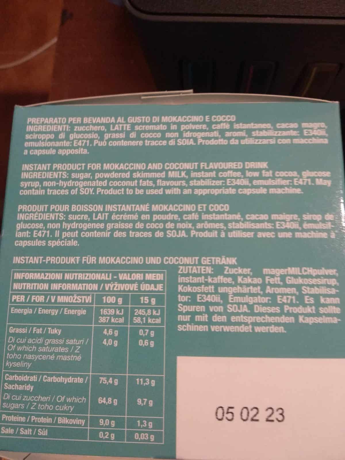 Skład: cukier, mleko odtłuszczone w proszku, kawa rozpuszczalna, odtłuszczone kakao, syrop glukozowy, olej kokosowy nieutwardzony, aromaty, stabilizator: aE340ii, emulgator: E471.