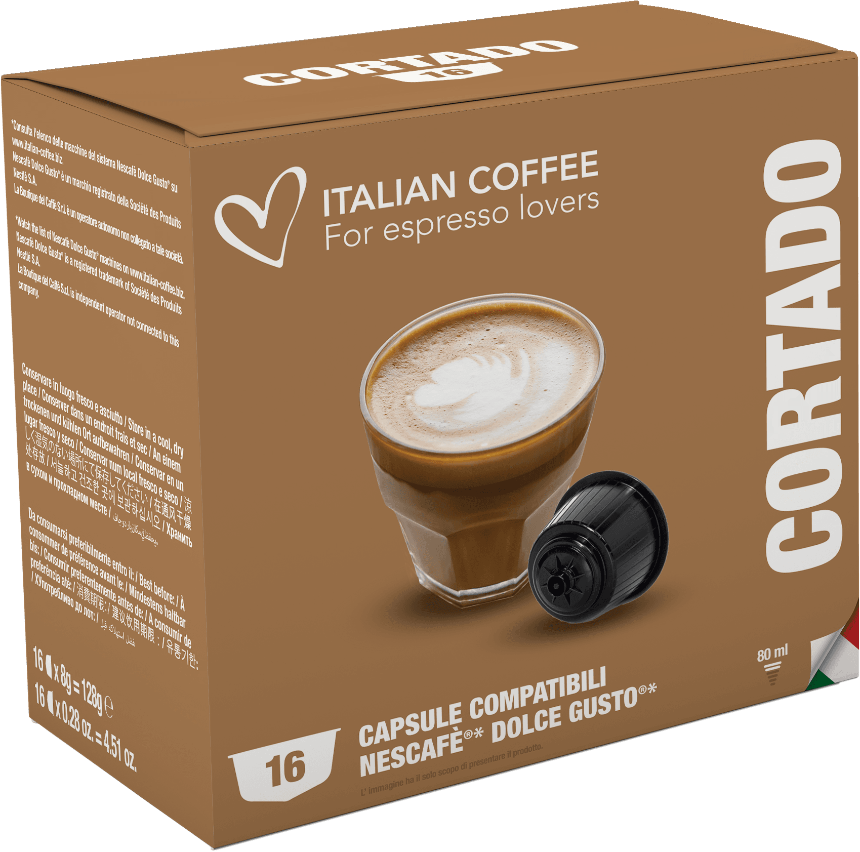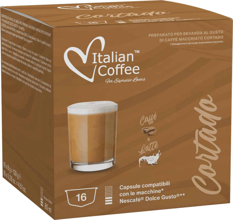 Cortado to kawa wywodząca się z gorącej Hiszpanii. W smaku jest trochę podobna do włoskiego Espresso Macchiato. W kapsułce Dolce Gusto znajduje się kawa o mocnym aromacie z nutami migdałów i orzechów pekan. Na powierzchni tego naparu tworzy się pianka o orzechowym kolorze i smaku, która sprawia, że picie go staje się prawdziwą przyjemnością. Jedna kapsułka Dolce Gusto wystarcza do zrobienia jednej filiżanki tego wyjątkowego naparu. Cortado to idealne połączenie Arabiki i Robusty, dwóch najbardziej znanych na świecie odmian kaw.