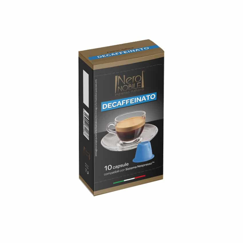 Wiele osób, chociaż lubi smak kawy, to ze względu na to, że znajduje się w niej kofeina, to nie może po nią sięgać. Rozwiązaniem dla nich może być kawa bezkofeinowa. Tym razem proponujemy Ci kapsułki kompatybilne z systemem Nespresso Decaffeinato NeroNobile. Ta kawa charakteryzuje się małą intensywnością oraz delikatną konsystencją. Ma również subtelny aromat. Jest idealna dla Ciebie jeżeli Twój organizm nie toleruje kofeiny, albo wtedy, gdy chcesz po prostu wypić filiżankę ulubionej kawy wieczorem.