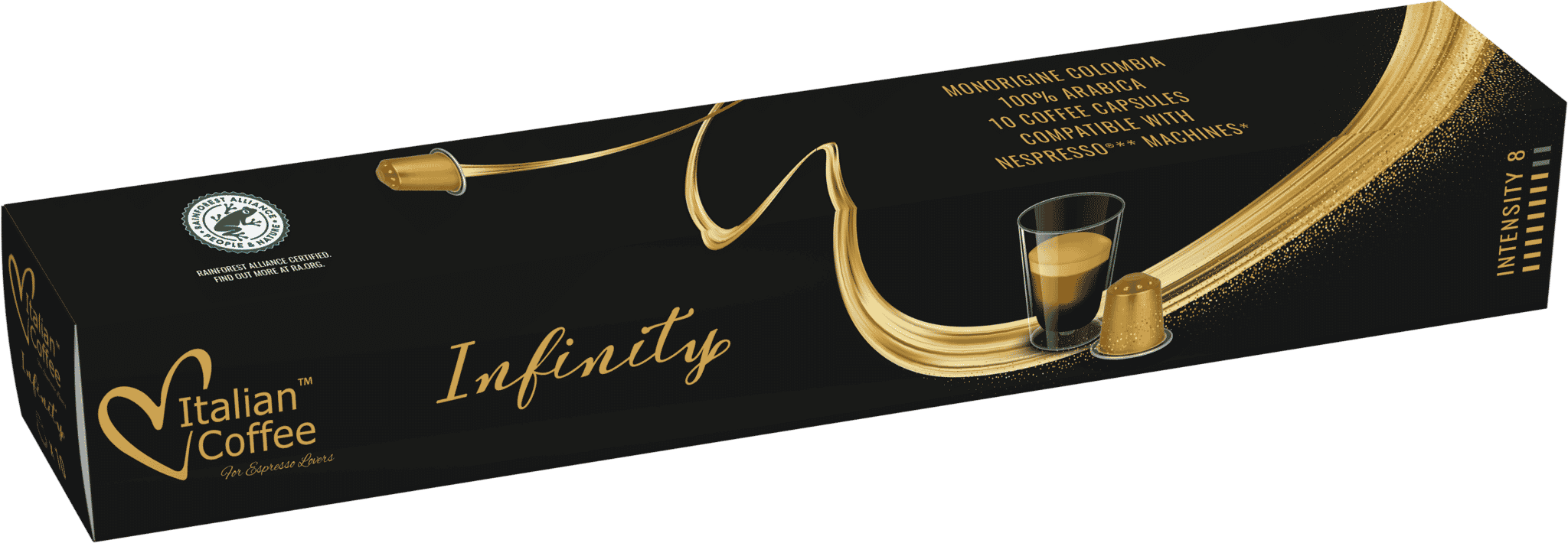 Eleganckie opakowanie zawiera 10 kapsułek aluminiowych z kawą paloną i mieloną. Kapsułki są kompatybilne z systemem Nespresso. Doskonała kawa zachwyci swoim kolumbijskim aromatem. Infinity to mieszanka single – origin stworzona na bazie ziaren Arabiki pochodzących z Kolumbii, która wydobywa typową dla kawy z tego regionu kwasowość, zawsze zrównoważoną dzięki średniemu wypaleniu, a także cytrusowe tony, którym towarzyszą aromaty karmelu i żółtych owoców. Kawa ta charakteryzuje się bogatym aromatem i otulającym smakiem – słodkim, delikatnym i zrównoważonym.