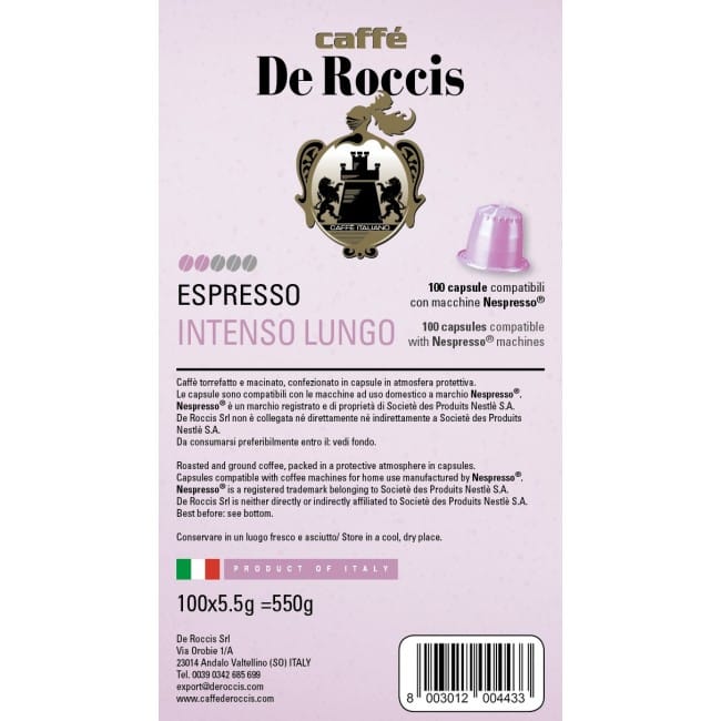 Jeżeli lubisz pić kawę w dużych kubkach, to sięgnij po Intenso Lungo De Roccis. Z jednej kapsułki kompatybilnej z systemem Nespresso® szybko przygotujesz espresso lungo, czyli tradycyjny włoski napar mieszczący się w filiżance o pojemności 110ml. W kapsułkach kompatybilnych z systemem Nespresso® zostały zamknięte wyselekcjonowane ziarna kawy z upraw znajdujących się w Ameryce Środkowej, Brazylii, Indii oraz Indonezji. Napar jest delikatny w smaku i pełen dodającej energii kofeiny. Doskonale smakuje rano.