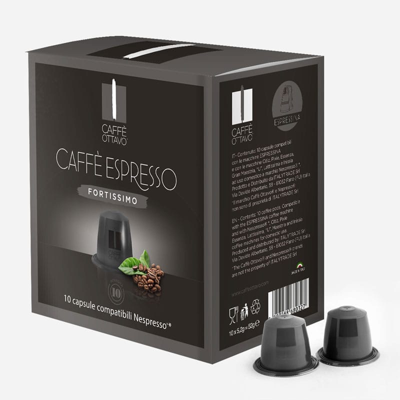 Ottavo Fortissimo to kawa odpowiednia dla wielbicieli mocnych wrażeń. W kapsułce kompatybilnej z systemem Nespresso® znajduje się 100% ziaren Robusty o bardzo wysokiej jakości. Najczęściej uprawia się ją w Afryce. Jak wiadomo, jest to odmiana, która charakteryzuje się długim posmakiem i zawiera duże ilości kofeiny. Poranne pobudzenie gwarantowane! Można w niej wyczuć również charakterystyczną goryczkę oraz lekko ziemisty aromat. Kapsułki kompatybilne z systemem Nespresso® do ekspresu ciśnieniowego umożliwią Ci szybkie przygotowanie ulubionej kawy.