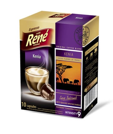 Rene Kenia to kawa w kapsułkach mielona i palona. Kawa Kenia to kompozycja najlepszych ziaren kawy Arabica z Kenii o średniej kwasowości i lekkiej czekoladowej nucie.