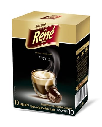 Ristretto to mieszanka kaw o wyrazistym smaku od najlepszych plantatorów kawowców z Afryki, Azji i Ameryki Środkowej – najlepsza do podawania w małej filiżance. Rene Ristretto to niezwykła kawa. Przygotujesz ją ze starannie wyselekcjonowanych ziaren Arabiki z plantacji w Ameryce Południowej i Wschodniej Afryce. Znajdziesz je w naszych kapsułkach kompatybilnych z systemem Nespresso®. Ziarna pochodzące z poszczególnych kontynentów są osobno palone. Dzięki temu wydobyty został z nich szlachetny, owocowy smak. Kapsułki Nespresso kompatybilne z systemem Nespresso® pakowane są osobno, co pozwala na zachowanie wszystkich zalet kawy przez długi czas. Rene Ristretto jest intensywna w smaku, a jednocześnie kremowa. Zawiera nieduże ilości kofeiny.