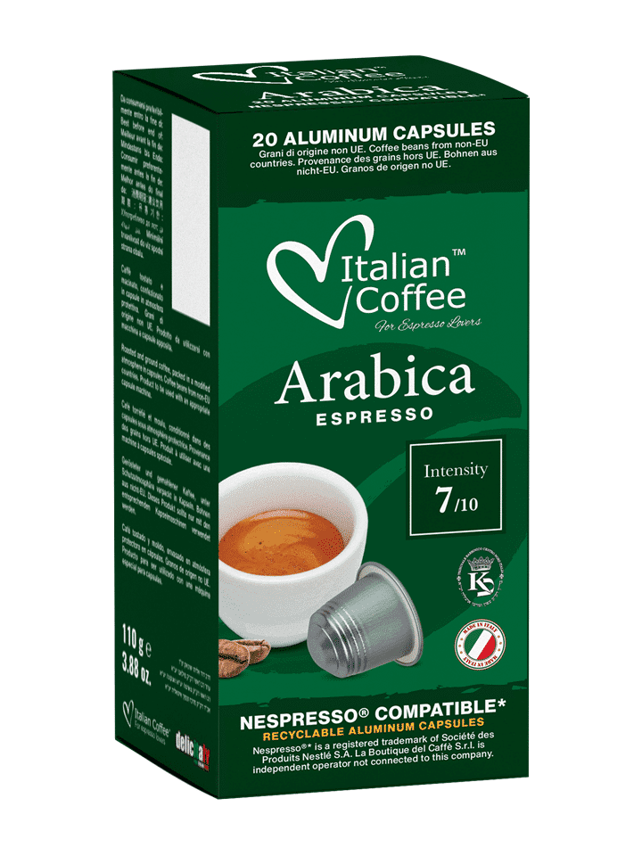 Balenie obsahuje 20 hliníkových kapsúl s praženou a mletou kávou. Kapsuly kompatibilné so systémom Nespresso. Arabica je jednou z najznámejších a najcennejších odrôd kávy na svete. Vyznačuje sa jemnou, sladkokyslou chuťou, ktorá pomaly uvoľňuje tóny kakaa a vanilky. Arabica je tiež cenená po celom svete pre svoju nízku hladinu kofeínu a môžete ju piť, kedykoľvek chcete, dokonca aj neskoro popoludní. Taliansku Arabicu strednej intenzity určite ocenia milovníci kávy. Bude ideálny na stimuláciu ráno a bude dobre fungovať aj počas dňa. Jedinečná forma kapsúl je neuveriteľne pohodlná a ľahko sa pripravuje.